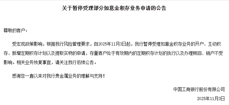 中国工商银行于11月3日发布公告,宣布受宏观政策影响,根据相关风险管理要求,自即日起暂停受理“如意金积存”业务的新开户、主动积存、新增定期积存计划及提取实物申请。存量客户的已有定投计划执行、赎回及销户等业务不受影响。