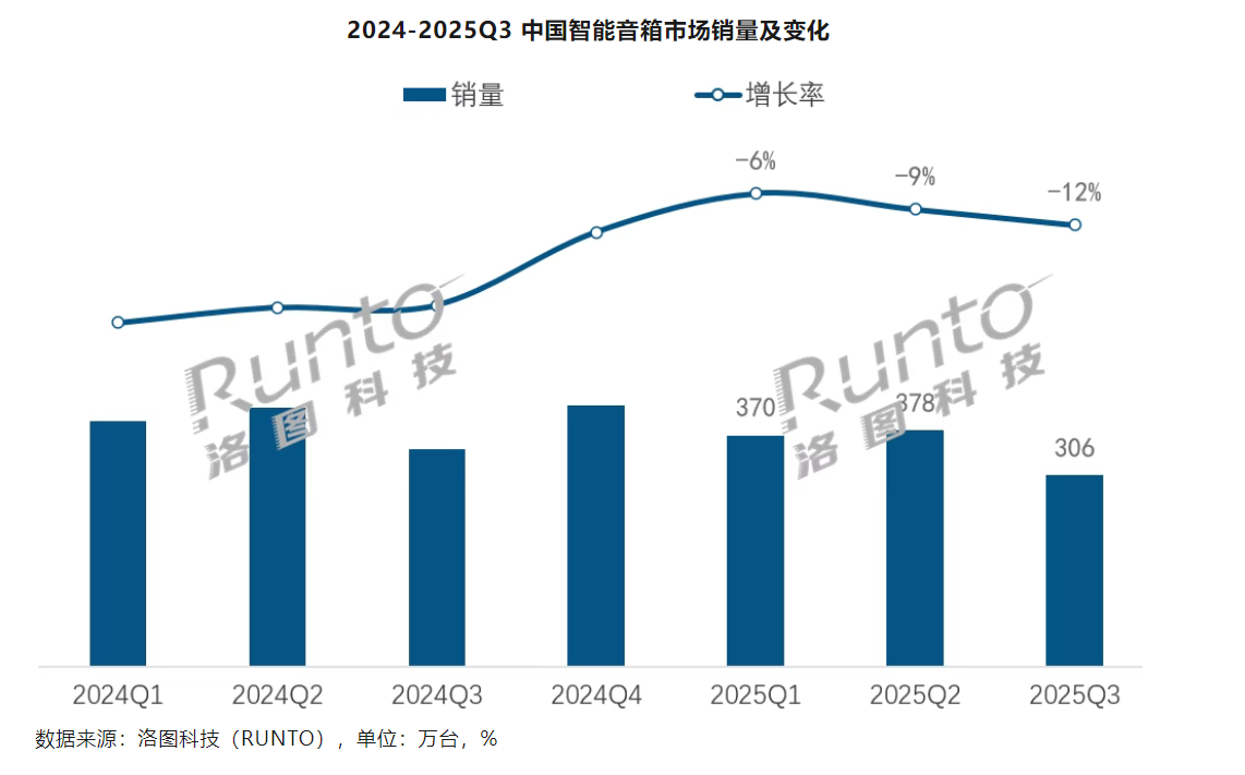 11月3日消息,洛图科技(RUNTO)最新发布的报告显示,2025年第三季度,中国智能音箱全渠道市场的销量为305.7万台,同比下降11.9%;市场销售额为8.6亿元,同比下降4.0%;均价为280元,同比增长8.9%。