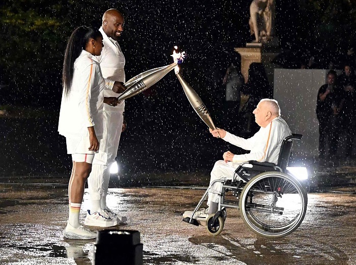 2024年巴黎奥运会开幕式上,科斯特坐轮椅传递火炬。