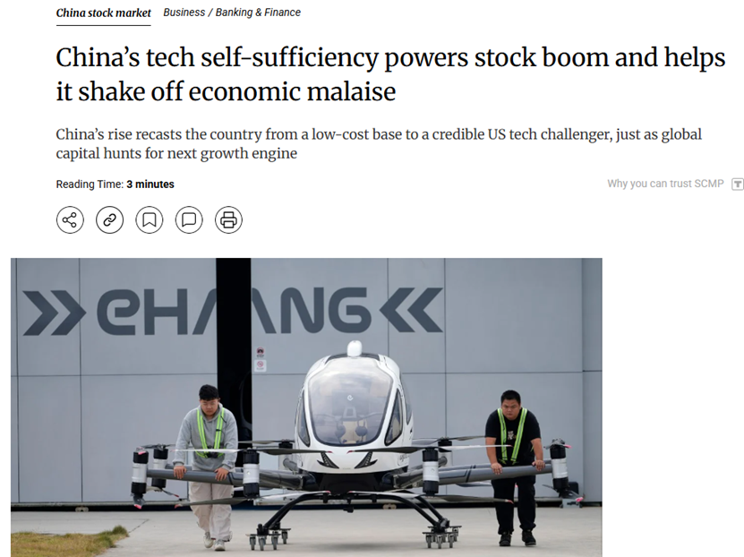 《南华早报》此前发文称,自2025年4月以来,中国本土科技的热议已成为推动中国股市牛市的单一最大动力;中国科技行业正推动股市繁荣,尤其是在人工智能、机器人、飞行汽车等领域。本土科技股指数和追踪中国科技股的香港指数涨幅跑赢纳斯达克。